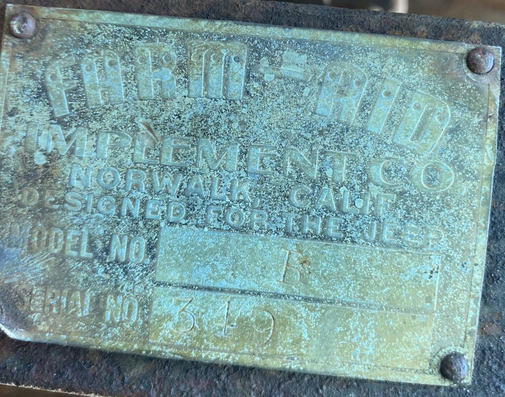 Recently, Kaleb from Missouri sent us this photo of a tag he found on “an old disc.” We will write more about this find. It does give us another interesting data point on both Farm-Aid implements and Transport Motor Company. TMC was a major West Coast Willys-Overland distributor before World War II and sold a line of specialty lifts (not based on the Ford/Ferguson system) and implements. TMC had a national distribution program, which we believe included the Farm-Aid line—another research project for the future.