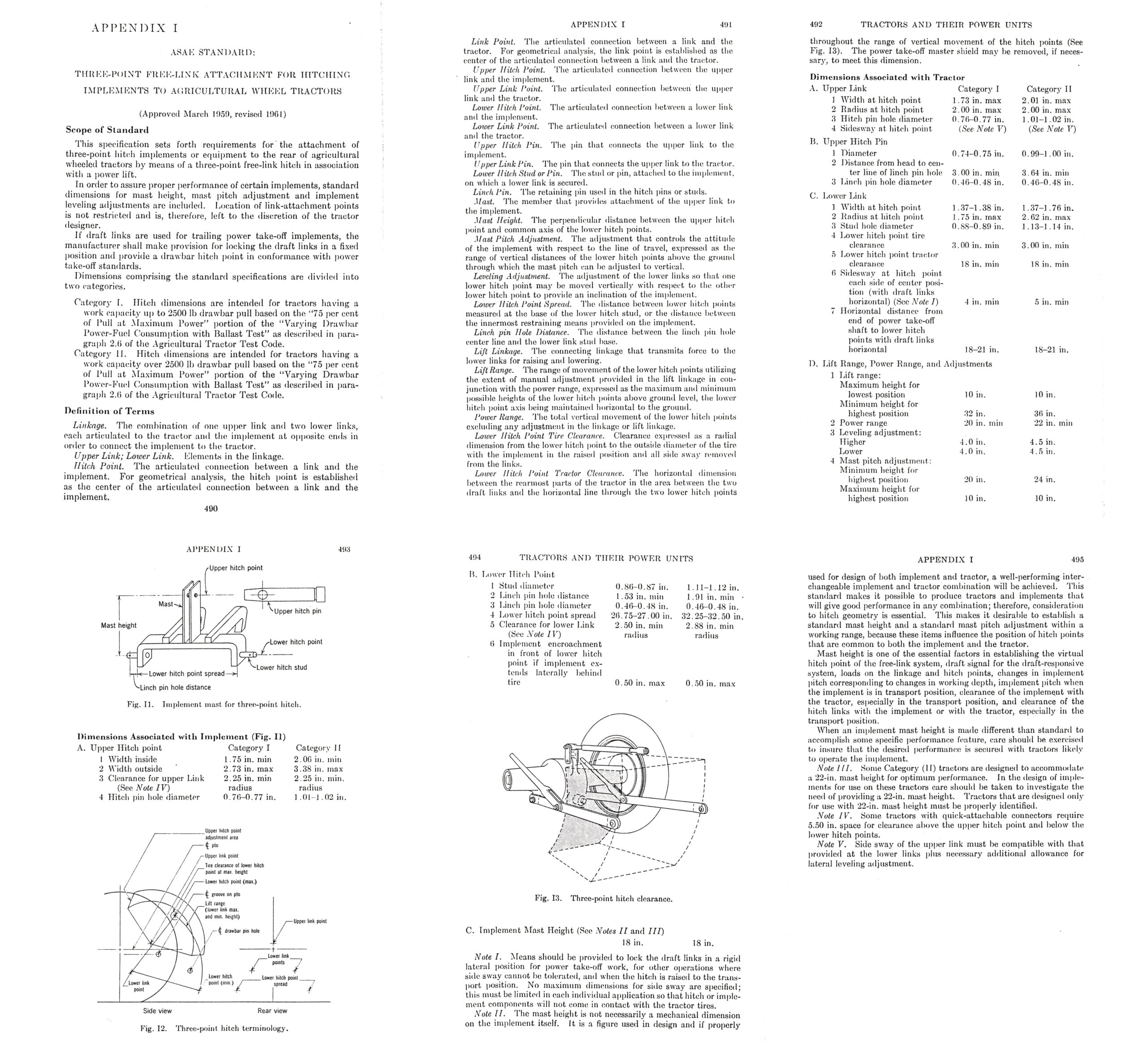 Mast heights are not discussed in the Ferguson plow literature. For our concerns, mast heights are dimensions specified in the ASAE Lift Category standards that were developed through the 1950’s. The Ferguson System that started the whole ball rolling in 1939 is known as Category I. There is way too much about it to discuss here, but in a nutshell, it establishes a multitude of dimensions (both working and static) between parts. One of these dimensions is the 18-inch mast height. This dimension is actually found on the implement rather than the 3-point lift itself, but it assures that said implement will lift, follow, and penetrate correctly within the Category I scope. Other categories are Category 0, Category II, and Category III. Each has its own unique working and static dimension standards. The Monroe Hydraulic Lift Kit is the only one of the five 3-point lift systems designed for the Jeep that fulfills the Category I standards. This means that all implements to be used with the Monroe Hydraulic Lift Kit must have a mast that is 18-inches in height. Making up the mast assembly is all of the parts that attach to the plow frame, extend upward, and terminate at the Upper Hitch Point. Measuring from the upper Hitch Point down perpendicular to the common axis between the two Lower Hitch Points would equal 18-inches. In the case of the plow, the Lower Hitch Points are located one on each end of the cross shaft. These three hitch points are what connect an implement to the two lower links and the one upper link on a 3-point lift. See the ASAE terminology and geometry for Category I 3-point lifts below: