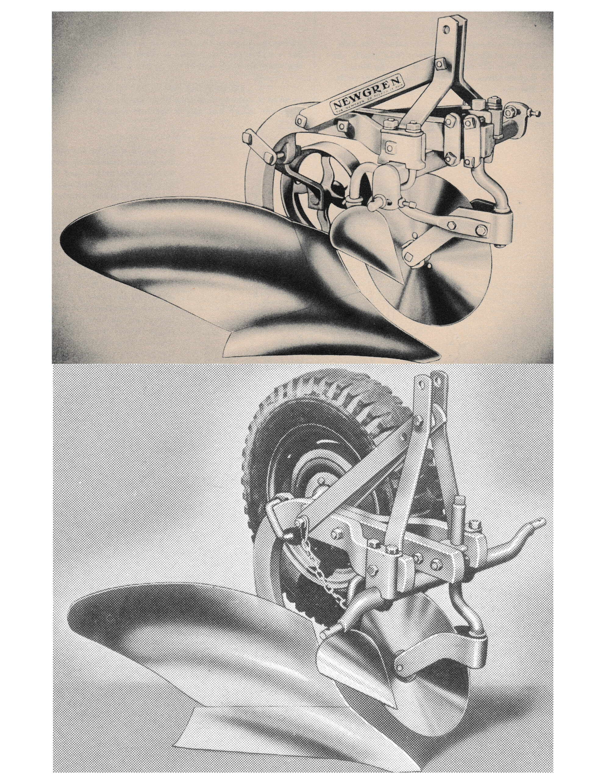 The manual above includes a picture of a newer Ferguson plow than the one shown near the beginning of this article, now with redesigned struts. Newgren would later use virtually the same struts on their second-generation plow designed for use with the Monroe Hydraulic Lift Kit. This image also contains terminology for the parts of the plow. Probably the most benefit to be gained from this literature can be found in the detailed explanation of Plow Bottom Characteristics, starting on page #4, with accompanying photos of clean plowing with nicely turned furrows. The different styles of moldboard plow bottoms are shown and explained along with the varying soil types and conditions that each is designed to work the best in. For reference, page #10 begins the explanation of Uneven Depth and Difficult Penetration, again with a very good photo to illustrate the point.