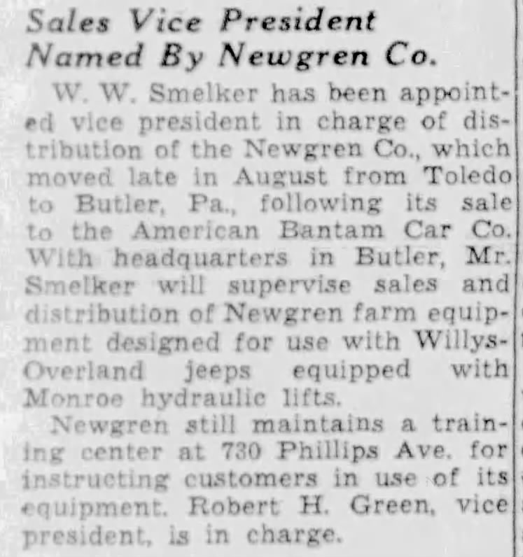 Newlin and Green retained their leadership roles at Newgren after Monroe purchased it. However, Monroe sold Newgren to American Bantam within a few months in a stock deal. In September 1948, Monroe announced that Newgren was moving from Toledo to Butler, PA, the home of American Bantam. George Newlin resigned from his position as head of the company to pursue a career in breeding purebred Guernsey cattle. He would become manager of Wood Acres Farm of Princeton, N.J.
