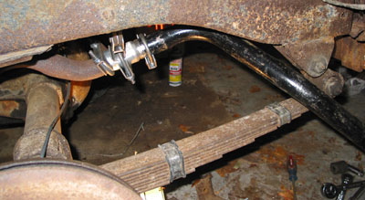 Not having the Willys available for rides and work was enough of a motivator for Barry to get the lift back on. He was able to use a combination of jacks and wood blocks to get the lift in place. He had installed an elbow on a hose that he thought was preventing the lift from lining up correctly. It quickly became clear that the hose was fine and something else was preventing the rear of the lift from moving into the proper position. What the eye couldn’t see, the hand could feel. A muffler hanger bracket was still attached to the middle of the frame. The perfectly matching rust of the frame and bracket made it almost invisible.