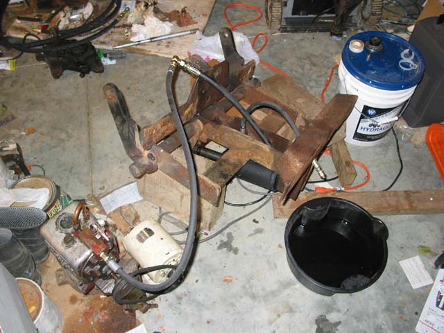 Barry, in his daily wanderings through e-bay, found a used 12 volt pump, without a reservoir. This pump fit nicely in the same space occupied by the old pump/reservoir setup. In a rush to get a test done, connections were made to the ram and the Newgren reservoir. However, a quick test with the plow was another disappointment. The plow would not lift completely.